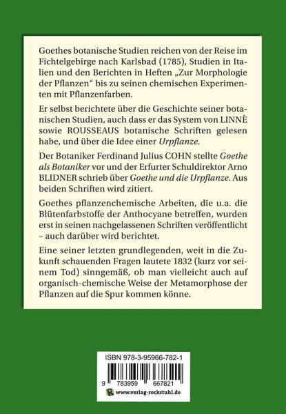 Autor: Prof. Dr. Georg Schwedt, Taschenbuch, 148 Seiten, 131 Fotos und AbbildungenÜBER DAS BUCH:Goethes botanische Studien reichen von der Reise im Fichtelgebirge nach Karlsbad (1785), Studien in Italien und den Berichten in Heften "Zur Morphologie der Pflanzen" bis zu seinen chemischen Experimenten mit Pflanzenfarben.Er selbst berichtete über die Geschichte seiner botanischen Studien, auch dass er das System von LINNÈ sowie ROUSSEAUS botanische Schriften gelesen habe, und über die Idee einer Urpflanze.Der Botaniker Ferdinand Julius COHN stellte Goethe als Botaniker vor und der Erfurter Schuldirektor Arno BLIDNER schrieb über Goethe und die Urpflanze. Aus beiden Schriften wird zitiert.Goethes pflanzenchemische Arbeiten, die u.a. die Blütenfarbstoffe der Anthocyane betreffen, wurden erst in seinen nachgelassenen Schriften veröffentlicht - auch darüber wird berichtet.Eine seiner letzten grundlegenden, weit in die Zukunft schauenden Fragen lautete 1832 (kurz vor seinem Tod) sinngemäß, ob man vielleicht auch auf organisch-chemische Weise der Metamorphose der Pflanzen auf die Spur kommen könne.
