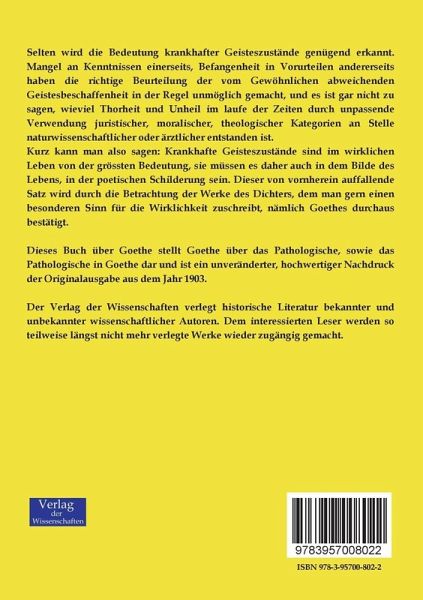 Dieses Buch über Goethe stellt Goethe über das Pathologische, sowie das Pathologische in Goethe dar und istein unveränderter, hochwertiger Nachdruck der Originalausgabe aus dem Jahr 1903.