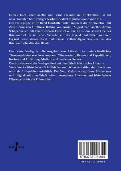 Der vorliegende dritte Band beinhaltet unter anderem die Briefwechsel mit Zelter, Sara von Grotthus, Bettine von Arnim, August von Goethe, Arthur Schopenhauer, mit verschiedenen Fürstlichkeiten, Künstlern, sowie Goethes Briefwechsel im amtlichen Verkehr, mit der Jugend und vielen weiteren. Ergänzt wird dieser Band mit einem vollständigen Register zu den Briefwechseln aller drei Bände.