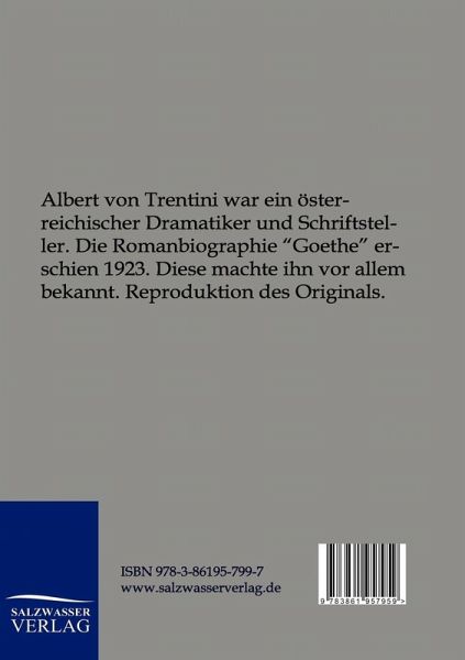 Albert von Trentini war ein österreichischer Dramatiker und Schriftsteller. Die Romanbiographie "Goethe" erschien 1923. Diese machte ihn vor allem bekannt. Reprint des Originals.