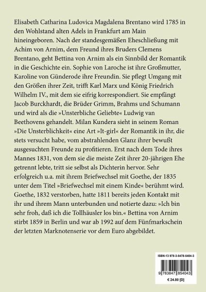 Bettina von Arnim: Goethes Briefwechsel mit einem Kinde. Seinem DenkmalLesefreundlicher Großdruck in 16-pt-SchriftGroßformat, 210 x 297 mmBerliner Ausgabe, 2022Durchgesehener Neusatz mit einer Biografie der Autorin bearbeitet und eingerichtet von Theodor BorkenErstdruck: Grünberg und Leipzig (Friedrich Wilhelm Levysohn) 1840.Textgrundlage ist die Ausgabe:Bettina von Arnim: Werke und Briefe. Herausgegeben von Gustav Konrad, Bde. 1-5, Frechen: Bartmann, 1959.Gesetzt aus der Minion Pro, 16 pt.Henricus - Edition Deutsche Klassik GmbHÜber die Autorin:Elisabeth Catharina Ludovica Magdalena Brentano wird 1785 in den Wohlstand alten Adels in Frankfurt am Main hineingeboren. Nach der standesgemäßen Eheschließung mit Achim von Arnim, dem Freund ihres Bruders Clemens Brentano, geht Bettina von Arnim als ein Sinnbild der Romantik in die Geschichte ein. Sophie von Laroche ist ihre Großmutter, Karoline von Günderode ihre Freundin. Sie pflegt Umgang mit den Größen ihrer Zeit, trifft Karl Marx und König Friedrich Wilhelm IV., mit dem sie eifrig korrespondiert. Sie empfängt Jacob Burckhardt, die Brüder Grimm, Brahms und Schumann und wird als die »Unsterbliche Geliebte« Ludwig van Beethovens gehandelt. Milan Kundera sieht in seinem Roman »Die Unsterblichkeit« eine Art »It-girl« der Romantik in ihr, die stets versucht habe, vom abstrahlenden Glanz ihrer bewußt ausgesuchten Freunde zu profitieren. Erst nach dem Tode ihres Mannes 1831, von dem sie die meiste Zeit ihrer 20-jährigen Ehe getrennt lebte, tritt sie selbst als Dichterin hervor. Sehr erfolgreich u.a. mit ihrem Briefwechsel mit Goethe, der 1835 unter dem Titel »Briefwechsel mit einem Kinde« berühmt wird. Goethe, 1832 verstorben, hatte 1811 bereits jeden Kontakt mit ihr und ihrem Mann unterbunden und notierte dazu: »Ich bin sehr froh, daß ich die Tollhäusler los bin.« Bettina von Arnim stirbt 1859 in Berlin und war ab 1992 auf dem Fünfmarkschein der letzten Marknotenserie vor dem Euro abgebildet.