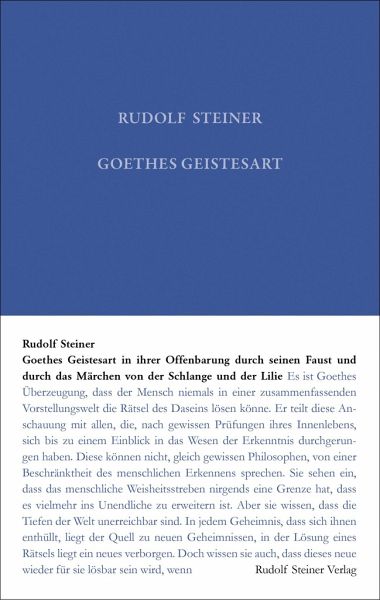 Inhalt: Goethes 'Faust' als Bild seiner esoterischen Weltanschauung (1902) / Goethes Geistesart in ihrer Offenbarung durch seinen 'Faust' (1918) / Goethes Geistesart in ihrer Offenbarung durch sein 'Märchen von der grünen Schlange und der Lilie' (1899/1918)