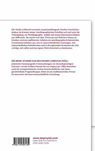 Die Studie geht von einem engen Zusammenhang zwischen Goethes Geschichtsdenken und seinem Autobiographieverständnis aus, zumal Goethe selbst die Autobiographie (auch) als historiographische Gattung definiert. Sie zeigt, inwiefern Goethes spezifisches Geschichtsdenken Einfluss auf Form, Inhalt und Konzeption seiner Autobiographischen Schriften nimmt bzw. sogar eine enge Wechselwirkung zwischen Geschichtsdenken und autobiographischen Arbeiten besteht.