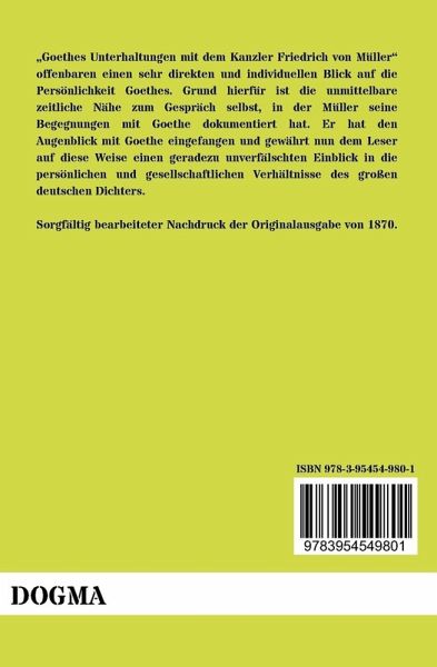 Goethes Unterhaltungen mit dem Kanzler Friedrich von Müller offenbaren einen sehr direkten und individuellen Blick auf die Persönlichkeit Goethes. Grund hierfür ist die unmittelbare zeitliche Nähe zum Gespräch selbst, in der Müller seine Begegnungen mit Goethe dokumentiert hat. Er hat den Augenblick mit Goethe eingefangen und gewährt nun dem Leser auf diese Weise einen geradezu unverfälschten Einblick in die persönlichen und gesellschaftlichen Verhältnisse des großen deutschen Dichters.