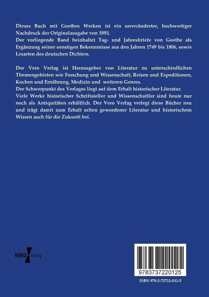 Dieses Buch mit Goethes Werken ist ein unveränderter, hochwertiger Nachdruck der Originalausgabe von 1892. Der vorliegende Band beinhaltet Tag- und Jahresbriefe von Goethe als Ergänzung seiner sonstigen Bekenntnisse aus den Jahren 1749 bis 1806, sowie Lesarten des deutschen Dichters. Der Vero Verlag ist Herausgeber von Literatur zu unterschiedlichen Themengebieten wie Forschung und Wissenschaft, Reisen und Expeditionen, Kochen und Ernährung, Medizin und weiteren Genres. Der Schwerpunkt des Verlages liegt auf dem Erhalt historischer Literatur. Viele Werke historischer Schriftsteller und…mehr
