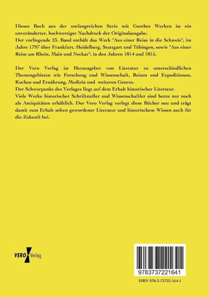 Der vorliegende 23. Band enthält das Werk "Aus einer Reise in die Schweiz", im Jahre 1797 über Frankfurt, Heidelberg, Stuttgart und Tübingen, sowie "Aus einer Reise am Rhein, Main und Neckar", in den Jahren 1814 und 1815.