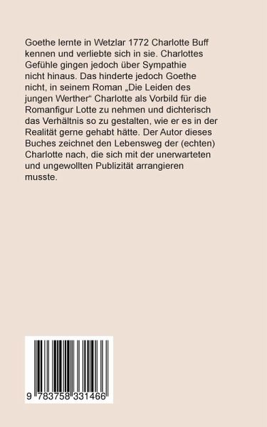 Goethe lernte in Wetzlar 1772 Charlotte Buff kennen und verliebte sich in sie. Charlottes Gefühle gingen jedoch über Sympathie nicht hinaus. Das hinderte jedoch Goethe nicht, in seinem Roman "Die Leiden des jungen Werther" Charlotte als Vorbild für die Romanfigur Lotte zu nehmen und dichterisch das Verhältnis so zu gestalten, wie er es in der Realität gerne gehabt hätte. Der Autor dieses Buches zeichnet den Lebensweg der echten Charlotte nach, die sich mit der unerwarteten und ungewollten Publizität arrangieren musste.