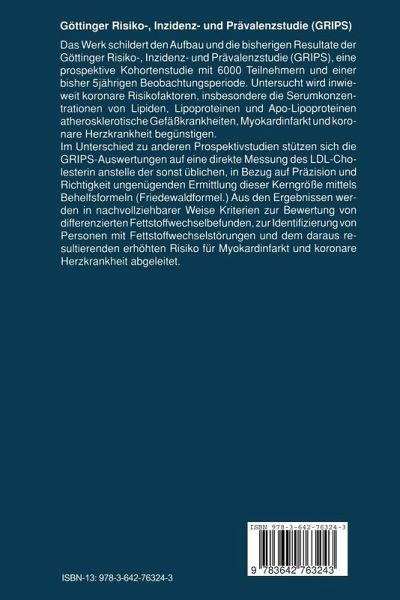 Das Werk schildert den Aufbau und die bisherigen Resultate der Göttinger Risiko-, Inzidenz- und Prävalenzstudie (GRIPS), eine prospektive Kohortenstudie mit 6000 Teilnehmern und einer bisher 5-jährigen Beobachtungsperiode. Untersucht wird, inwieweit koronare Risikofaktoren, insbesondere die Serumkonzentrationen von Lipiden, Lipoproteinen und Apo-Lipoproteinen, atherosklerotische Gefäßkrankheiten, Myokardinfarkt und koronare Herzkrankheit begünstigen. Im Unterschied zu anderen Prospektivstudien stützen sich die GRIPS-Auswertungen auf eine direkte Messung des LDL-Cholesterin anstelle der sonst üblichen, in Bezug auf Präzision und Richtigkeit ungenügenden Ermittlung dieser Kerngröße mittels Behelfsformeln (Friedewaldformel). Aus den Ergebnissen werden in nachvollziehbarer Weise Kriterien zur Bewertung von differenzierten Fettstoffwechselbefunden, zur Identifizierung von Personen mit Fettstoffwechselstörungen und dem daraus resultierenden erhöhten Risiko für Myokardinfarkt und koronare Herzkrankheit abgeleitet.