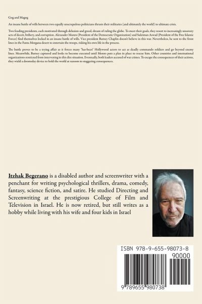 Gog and Magog Genre-fiction, Comedy, political Satire, Bizarre leaders, Fake Media, Unscrupulous Politicians ,Hollywood Superstars. Bizarre politicians are dragging the world into a hallucinatory war! An Insane Battle of Wills Between Two Equally Unscrupulous Politicians Thrusts Their Militaries (and Ultimately the World) to Ultimate Crisis. Two Feuding Presidents, Each Motivated Through Delusion and Greed, Dream of Ruling the Globe. To Meet Their Goals, They Resort to Increasingly Unsavory Acts of Deceit, Bribery, and Corruption. Alexander Monro (President of the Democratic Organization) and Suleiman Aswad (President of the Free Islamic Forces) Find Themselves Locked in an Insane Battle of Wills. Vice President Barney Chaplin Doesn't Believe in This War. Nevertheless, he was sent to the Front Lines in the Fanta Morgana Desert to Entertain the Troops, Risking his own Life in the Process. The Battle Proves to be a Trying Affair as it Forces Many "has-Been" Hollywood Actors to act as Deadly Commando Soldiers and go Beyond Enemy Lines. Meanwhile, Barney is Captured and Looks to Become Executed Until Monro Puts a Plan in Place to Rescue him. Other Countries and International Organizations are Restricted From Intervening in This Dire Situation. Eventually, Both Leaders Were Accused of War Crimes. To Escape the Consequences of Their Actions, They Wield a Doomsday Device to Hold the World at Ransom With Staggering Consequences.