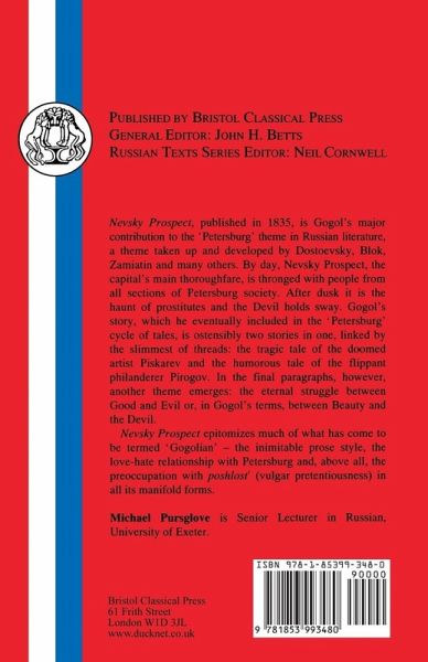 Nevsky Prospect, published in 1835, is Gogol's major contribution to the 'Petersburg' theme in Russian literature, a theme taken up and developed by Dostoevsky, Blok, Zamiatin and many others. By day, Nevsky Prospect, the capital's main thoroughfare, is thronged with people from all sections of Petersburg society. After dusk it is the haunt of prostitutes and the Devil holds sway. Gogol's story, which he eventually includes in the 'Petersburg' cycle of tales, is ostensibly two stories in one, linked by the slimmest of threads: the tragic tale of the flippant philanderer Pirogov. In the final paragraphs, another theme emerges: the struggle between Good and Evil or - in Gogol's terms - between Beauty and the Devil. Nevsky Prospect epitomizes much of what has come to be termed Gogolian, the inimitable prose style, the love hate relationship with Petersburg, and above all the preoccupation with poshlost (vulgar pretentiousness) in all its manifold forms.