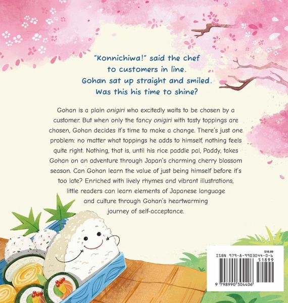 "We're at this famous shop in town, and yet it isn't fair. I'm the one onigiri that has no stunning flair!" But what if you are wonderful, made just the way you are? Gohan is a plain onigiri who excitedly waits to be chosen by a customer. But when only the fancy onigiri with tasty toppings are chosen, Gohan decides it's time to make a change. There's just one problem: no matter what toppings he adds to himself, nothing feels quite right. Nothing, that is, until his pal, Paddy, takes Gohan on an adventure through Japan's charming cherry blossom season. Enriched with lively rhymes and vibrant illustrations, little readers will learn elements of Japanese language and culture through Gohan's heartwarming journey of self-acceptance.