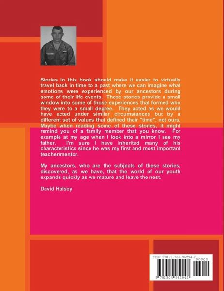 Stories in this book should make it easier to virtually travel back in time to a past where we can imagine what emotions were experienced by our ancestors during some of their life events. These stories provide a small window into some of those experiences that formed who they were to a small degree. They acted as we would have acted under similar circumstances but by a different set of values that defined their "time", not ours. Maybe when reading some of these stories, it might remind you of a family member that you know. For example at my age when I look into a mirror I see my father. I'm sure I have inherited many of his characteristics since he was my first and most important teacher/mentor. My ancestors, who are the subjects of these stories, discovered, as we have, that the world of our youth expands quickly as we mature and leave the nest.