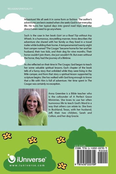 Adventure! We all seek it in some form or fashion. The author's adventures are best created when she seeks God in her everyday life. He turns her typical days into grand road trips, and she doesn't even need to go anywhere. Such is the case in her book Goin' on a Road Trip without Any Wheels. In a humorous, storytelling manner, Anna describes the adventure she shared with her family as they lived in a travel trailer while building their home. A temperamental twenty-eight foot camper named "The Cougar" became home for her and her husband, their two kids, and their dog for nine months. Their horse couldn't join them, she just wouldn't fit. But even without the horse, they had the journey of a lifetime. As she reflected on their time in The Cougar, God began to teach her some valuable spiritual lessons. Each chapter of the book tells of a funny story that unfolded while they were living in the little camper, and from that story a spiritual lesson supported by scripture begins. She has walked with God long enough to know that a life with Him is full of adventure. Her time spent in The Cougar was certainly no exception.