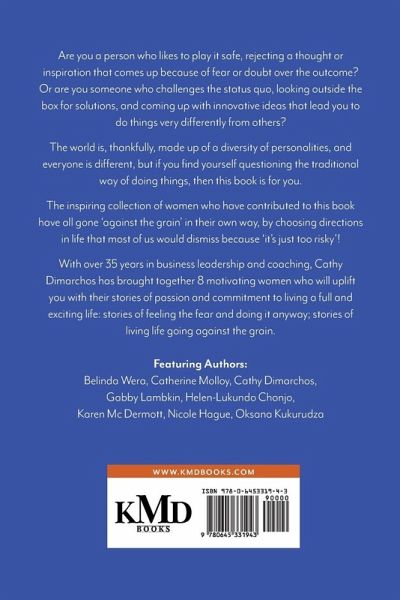 Are you a person who likes to play it safe, rejecting a thought or inspiration that comes up because of fear or doubt over the outcome? Or are you someone who challenges the status quo, looking outside the box for solutions, and coming up with innovative ideas that lead you to do things very differently from others? The world is, thankfully, made up of a diversity of personalities, and everyone is different, but if you fi nd yourself questioning the traditional way of doing things, then this book is for you. The inspiring collection of women who have contributed to this book have all gone 'against the grain' in their own way, by choosing directions in life that most of us would dismiss because 'it's just too risky'! With over 35 years in business leadership and coaching, Cathy Dimarchos has brought together 8 motivating women who will uplift you with their stories of passion and commitment to living a full and exciting life: stories of feeling the fear and doing it anyway; stories of living life going against the grain. Featuring Authors: Belinda Wera, Catherine Molloy, Cathy Dimarchos, Gabby Lambkin, Helen-Lukundo Chonjo, Karen Mc Dermott, Nicole Hague, Oksana Kukurudza