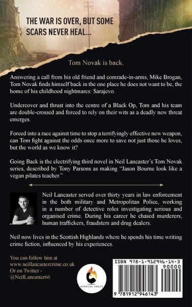 The war is over, but some scars never heal... Novak is back. Answering a call from his old friend and comrade-in-arms, Mike Brogan, Tom Novak finds himself back in the one place he does not want to be, the home of his childhood nightmares: Sarajevo. Undercover and thrust into the centre of a Black Op, Tom and his team are double-crossed and forced to rely on their wits as a deadly new threat emerges. Forced into a race against time to stop a terrifyingly effective new weapon, can Tom fight against the odds once more to save not just those he loves, but the world as we know it? Going Back is the electrifying third novel in Neil Lancaster's Tom Novak series, described by Tony Parsons as making "Jason Bourne look like a vegan pilates teacher."
