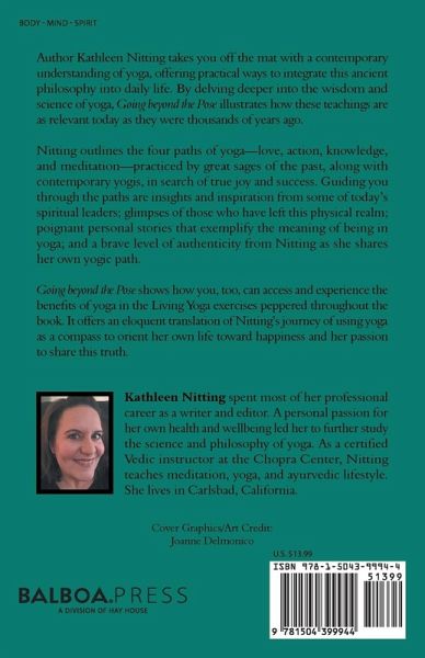 Author Kathleen Nitting takes you off the mat with a contemporary understanding of yoga, offering practical ways to integrate this ancient philosophy into daily life. By delving deeper into the wisdom and science of yoga, Going beyond the Pose illustrates how these teachings are as relevant today as they were thousands of years ago. Nitting outlines the four paths of yogalove, action, knowledge, and meditationpracticed by great sages of the past, along with contemporary yogis, in search of true joy and success. Guiding you through the paths are insights and inspiration from some of todays spiritual leaders; glimpses of those who have left this physical realm; poignant personal stories that exemplify the meaning of being in yoga; and a brave level of authenticity from Nitting as she shares her own yogic path. Going beyond the Pose shows how you, too, can access and experience the benefits of yoga in the Living Yoga exercises peppered throughout the book. It offers an eloquent translation of Nittings journey of using yoga as a compass to orient her own life toward happiness and her passion to share this truth.