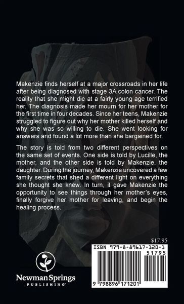 Makenzie finds herself at a major crossroads in her life after being diagnosed with stage 3A colon cancer. The reality that she might die at a fairly young age terrified her. The diagnosis made her mourn for her mother for the first time in four decades. Since her teens, Makenzie struggled to figure out why her mother killed herself and why she was so willing to die. She went looking for answers and found a lot more than she bargained for. The story is told from two different perspectives on the same set of events. One side is told by Lucille, the mother, and the other side is told by Makenzie, the daughter. During the journey, Makenzie uncovered a few family secrets that shed a different light on everything she thought she knew. In turn, it gave Makenzie the opportunity to see things through her mother's eyes, finally forgive her mother for leaving, and begin the healing process.