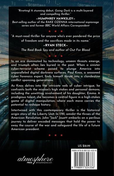 From the shadowy corners of the dark web to the historic halls of MIT, Paul Knox, a cyber forensics expert and former Air Force officer, is thrust into a high-stakes battle against a ruthless enemy. As he races to uncover a plot that threatens to plunge America into chaos, Paul must protect his brilliant daughter, Emma, whose cutting-edge research holds the key to the nation's survival. "Going Dark," perfect for fans of Steve Berry, Dan Brown, and Stephen Hunter. "GOING DARK is smart, detailed, and highly entertaining. The story resonates with spirit, blending fiction with reality and tragedy with triumph into a compelling thriller. Check it out." - Steve Berry, New York Times and #1 internationally bestselling author "With its gripping blend of cyber intrigue and historical drama, GOING DARK is more than just a thriller- it's a testament to the enduring power of loyalty, legacy, and the unbreakable bond between a father and his daughter." - Ryan Steck, The Real Book Spy and author of Out For Blood "Riveting! George Mehok delivers a stunning debut. With vivid story-telling and intricate plotting, he peels away level after level of today's most challenging issues." - Humphrey Hawksley, author of best-selling and former BBC Beijing Bureau Chief. In the aftermath of 9/11, remnants of Bin Laden's Al-Qaeda network quietly infiltrated the U.S. heartland, lying dormant for over two decades. On Thanksgiving Day, they strike-triggering a sinister cyber-terrorist plot poised to plunge America into unparalleled digital darkness. But it's only the beginning. Paul Knox, a seasoned NSA cybersecurity expert and former Air Force communications officer, is thrust into a clandestine conflict spanning generations. As Knox delves into a complex web of cyber intrigue, he must confront both the mission's high stakes and personal demons, including the unwitting involvement of his daughter, Emma, a brilliant MIT computer scientist who holds the key to the next-generation internet. The narrative intertwines with the origin story of the Liberty Unit's first member, John "Jack" Jouett. In 1791, Jouett embarks on a perilous mission to deliver a critical message from Thomas Jefferson to General Henry Knox, altering the Revolutionary War's trajectory. As the lines between past and present blur, Knox races against time to save his daughter and unravel mysteries that could reshape history. Going dark won't be a problem for a man who's spent his life tracking the "worst of the worst" on the dark web. But in this game, every move could be his last.