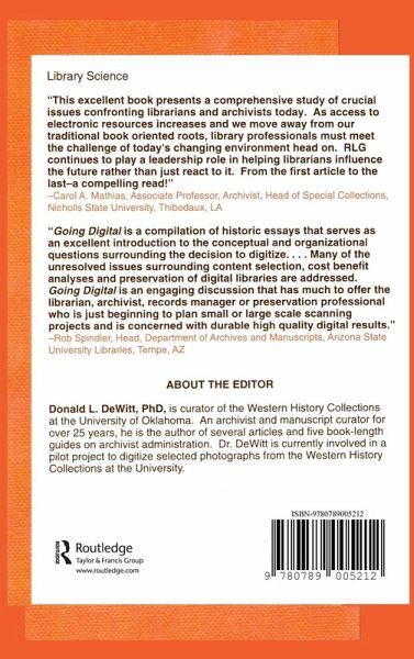 Going Digital: Strategies for Access, Preservation, and Conversion of Collections to a Digital Format is a collection of articles orginally presented at a series of five symposiums sponsored by the Research Libraries Group. It offers you succinct and analytic views of the problems and benefits of digital resources in the traditional academic library. Library administrators, collection managers, and librarians will learn the advantages and disadvantages of traditional and digital collections and the costs of providing local access or implementing remote access to digital collections. Originally presented at a series of five symposiums sponsored by the Research Libraries Group, the articles inGoing Digital will help you decide upon a cost-effective collection method that will meet the needs of your library, your patrons, and your budget.