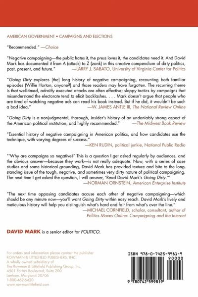 Going Dirty explores [the] long history of negative campaigning, recounting both familiar episodes (Willie Horton, anyone?) and those readers may have forgotten. The recurring theme is that well-timed, adroitly executed attacks are often effective; sloppy tactics by campaigns that misunderstand the electorate tend to elicit backlashes...Mark doesn't argue that people who are tired of watching negative ads can read his book instead. But if he did, it wouldn't be such a bad idea. -- W. James Antle III National Review Recommended. CHOICE Going Dirty is a nonjudgemental, thorough, insider's history of an undeniably strong aspect of the American political institution, and highly recommended. Midwest Book Review ...essential history of negative campaigning in American politics, and how candidates use the technique, with varying degrees of success. -- Ken Rudin, author of the Political Junkie blog for National Public Radio 'Why are campaigns so negative?' This is a question I get asked regularly by audiences, and the obvious answer-because they work-is not really adequate. Now, with a series of case studies and some historical grounding, David Mark has provided texture and bite to the longstanding issue of the tough, negative and sometimes very dirty nature of political campaigning. The next time I get asked the question, I will answer, 'Read David Mark's Going Dirty.' -- Norman Ornstein, American Enterprise Institute For the serious student of political campaigns, this book includes nearly everything you wanted to know about negative campaigning and has some very interesting case studies as tactics changed during the the television and Internet era. A chapter titled 'What Good Old Days' reminds us that negative campaigning is an American tradition. Recommended. Taegan Goddard's Political Wire The next time opposing candidates accuse each other of negative campaigning-which should be any minute now-you'll want Going Dirty within easy reach. David Mark's lively and meticulous history will help you distinguish what's hard and fair from what's over the line. -- Michael Cornfield, scholar and author of Politics Moves Online: Campaigning and the Internet A must-read for anyone interested in the negative ads that have come to dominate our campaigns. -- Robert M. Stern, Center for Governmental Studies Negative campaigning-the public hates it, the press loves it, the candidates need it. And David Mark has documented it from A (attack) to Z (zonk) in this creative compendium of dirty politics, past, present, and future. -- Larry J. Sabato, University of Virginia Center for Politics