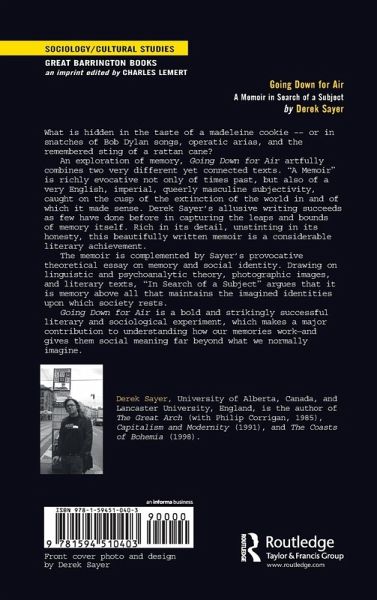 What is hidden in the taste of a madeleine cookie-or in snatches of Bob Dylan songs, operatic arias, and the remembered sting of a rattan cane? An exploration of memory, Going Down for Air artfully combines two very different yet connected texts. A Memoir is richly evocative not only of times past, but also of a very English, imperial, queerly masculine subjectivity, caught on the cusp of the extinction of the world in and of which it made sense. Derek Sayer's allusive writing succeeds as few have done before in capturing the leaps and bounds of memory itself. Rich in its detail, unstinting in its honesty, this beautifully written memoir is a considerable literary achievement. The memoir is complemented by Sayer's provocative theoretical essay on memory and social identity. Drawing on linguistic and psychoanalytic theory, photographic images, and literary texts, In Search of a Subject argues that it is memory above all that maintains the imagined identities upon which society rests.