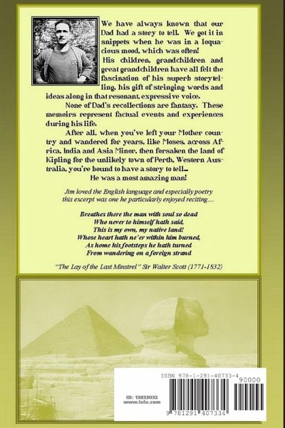 Born with a determination to better himself, young Jim rose from scraping a living for himself and his Mum by the meanest of jobs to a respected and capable soldier in the South Staffordshire Regiment. His exploits and experiences led him to India where he met the love of his life whom he married and with whom he raised a large family. India in the 1930's and '40's held a fascination like no other country. From confronting dangerous situations - including coming face to face with cobras, panthers and snakes as well as owning many weird and wonderful pets, Jim's life was never without excitement. After Indian Independence, Jim moved his family to Perth, in Western Australia in 1949 where he used his immense ingenuity, intelligence and ability and worked without ceasing, to provide his family with a moderate and comfortable lifestyle. He was an amazing man!