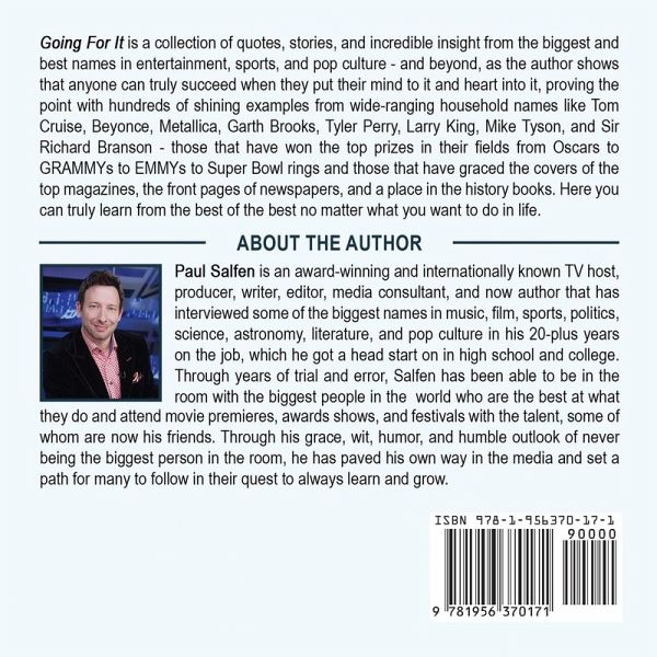 2024 International Impact Book Award Winner - Inspirational Category Going For It is a collection of quotes, stories, and incredible insight from the biggest and best names in entertainment, sports, and pop culture - and beyond, as the author shows that anyone can truly succeed when they put their mind and heart into it. The books proves the point with hundreds of shining examples from wide-ranging household names like Tom Cruise, Beyonce, Metallica, Garth Brooks, Tyler Perry, Larry King, Mike Tyson, and Sir Richard Branson - those that have won the top prizes in their fields from Oscars to Grammys to Emmys to Super Bowl rings and those that have graced the covers of top magazines, the front pages of newspapers, and a place in history books. Here you can truly learn from the best of the best, no matter what you want to do in life.