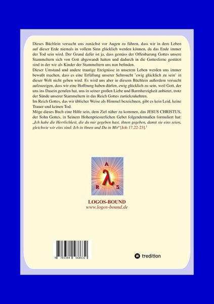 Dieses Büchlein versucht uns zunächst vor Augen zu führen,dass wir in dem Leben auf dieser Erde niemals in vollem Sinn glücklich werden können, da das Ende immer der Tod sein wird. Der Grund dafür ist ja, dass gemäss der Offenbarung Gottes unsere Stammeltern sich von Gott abgewandt hatten und dadurch in die Gottesferne gestürzt sind in der wir als Kinder der Stammeltern uns nun befinden. Dieser Umstand und andere traurige Ereignisse in unserem Leben werden uns immer bewußt machen, dass es eine Erfüllung unserer Sehnsucht 'ewig glücklich zu sein' in dieser Welt nicht geben wird. Es wird uns aber in diesem Büchlein außerdem versucht aufzuzeigen, dass wir eine Hoffnung haben dürfen, ewig glücklich zu sein, weil Gott, der uns ins Dasein gerufen hat, uns in seiner großen Liebe und Barmherzigkeit anbietet, trotz der Sünde unserer Stammeltern in das Reich Gotteszurückzukehren.Im Reich Gottes, das wir üblicher Weise als Himmel bezeichnen, gibt es kein Leid, keine Trauer und keinen Tod.