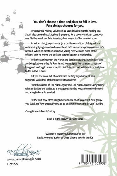 You don’t choose a time and place to fall in love. Fate always chooses for you. When Ronnie McIlroy volunteers to spend twelve months nursing in a South Vietnamese hospital, she’s ill-prepared for a poverty-stricken country at war. Neither weak nor faint-hearted, she’s way out of her comfort zone. American pilot, Joseph Hunter Jr, is on his second tour of duty. With an outstanding flying record and a cool head, he’ll take an Iroquois anywhere he’s needed. When he meets an attractive young New Zealand nurse at the officer’s club, he knows the odds are stacked against a relationship. With the war between the North and South escalating, hundreds of lives are being lost every day. As Ronnie and Joe navigate the constant dangers of living and working in a war zone, it’s clear fate has decided their time and place to fall in love is now. But will one naïve act of compassion destroy any chance of a life together? Will either of them leave Vietnam alive? From the author of The Nam Legacy and The Nam Shadow, Going Home takes us back to the sixties, to a propaganda fuelled war, a determined enemy and a fragile hope for survival. "In the end, only three things matter: how much you loved, how gently you lived, and how gracefully you let go of things not meant for you." Buddha Going Home is Ronnie’s story.