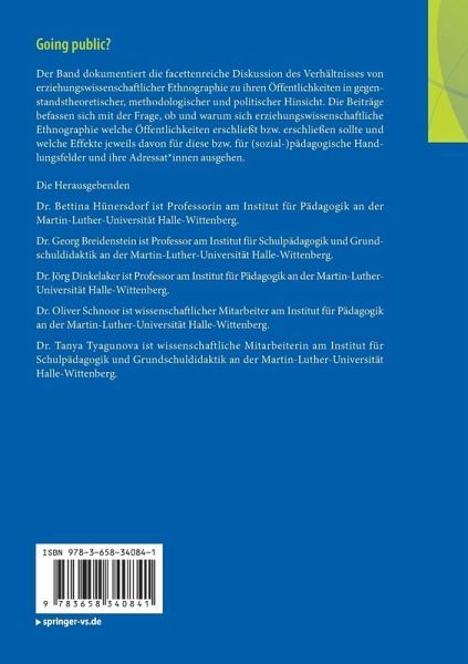 Zum Umgang mit der konstitutiven Kraft von Machtverhältnissen und öffentlichen Diskursen bei ethnographischen Untersuchungen im Kontext von Flucht*Migration und Bildung: Verstrickungen und Strategien.- Hausaufgaben in der Familienöffentlichkeit.- Komplexe Öffentlichkeitsverhältnisse: Zur Erstellung von Transferprodukten im Kontext einer ungleichheitstheoretischen Ethnographie zur Zusammenarbeit von Kita und Familie.- Birthday Parents and Representation. Ethnography as a basis for fictional film?- Die Produktion der Emotionen - produktive Emotionen? Methodologische Weiterentwicklungen praxistheoretischer Forschung zu Subjektivierung in Schulklassen.- Das 'theoretische Engagement' erziehungswissenschaftlicher Ethnografie: Überlegungen zur ethnografischen 'Aufgabe der Übersetzung.- Öffentlichkeit(en) und Privatheit(en) in erziehungswissenschaftlicher Forschung.- Forschungspolitische Reflexionen revisited: Befunde einer Diskursethnografie der Wissenskultur 'Childhood-Studies'.- Improving the self in the public of the classroom.