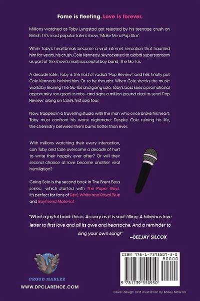 Fame is fleeting. Love is forever. Millions watched as Toby Lyngstad got rejected by his teenage crush on British TV's most popular talent show, 'Make Me a Pop Star'. While Toby's heartbreak became a viral internet sensation that haunted him for years, his crush, Cole Kennedy, skyrocketed to global superstardom as part of the show's most successful boy band, The Go Tos. A decade later, Toby is the host of radio's 'Pop Review', and he's finally put Cole Kennedy behind him. Or so he thought. When Cole shocks the music world by leaving The Go Tos and going solo, Toby's boss sees a promotional opportunity too good to miss-and signs a million-pound deal to send 'Pop Review' along on Cole's first solo tour. Now, trapped in a travelling studio with the man who once broke his heart, Toby must confront his worst nightmare: Despite Cole ruining his life, the chemistry between them burns hotter than ever. With millions watching their every interaction, can Toby and Cole overcome a decade of hurt to write their happily ever after? Or will their second chance at love become another viral humiliation? Going Solo is the second book in The Brent Boys series, which started with The Paper Boys. It's perfect for fans of Red, White and Royal Blue and Boyfriend Material.