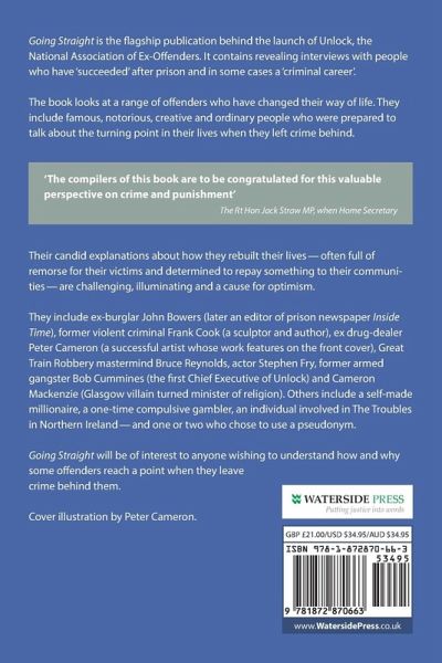 Going Straight is the flagship publication behind the launch of Unlock, the National Association of Ex-Offenders. It contains revealing interviews with people who have 'succeeded' after prison and in some cases a 'criminal career'. The book looks at a range of offenders who have changed their way of life. They include famous, notorious, creative and ordinary people who were prepared to talk about the turning point in their lives when they left crime behind. Their candid explanations about how they rebuilt their lives - often full of remorse for their victims and determined to repay something to their communities - are challenging, illuminating and a cause for optimism. They include ex-burglar John Bowers (later an editor of prison newspaper Inside Time), former violent criminal Frank Cook (a sculptor and author), ex drug-dealer Peter Cameron (a successful artist whose work features on the front cover), Great Train Robbery mastermind Bruce Reynolds, actor Stephen Fry, former armed gangster Bob Cummines (the first Chief Executive of Unlock) and Cameron Mackenzie (Glasgow villain turned minister of religion). Others include a self-made millionaire, a one-time compulsive gambler, an individual involved in The Troubles in Northern Ireland - and one or two who chose to use a pseudonym. Going Straight will be of interest to anyone wishing to understand how and why some offenders reach a point when they leave crime behind them. Cover illustration by Peter Cameron.