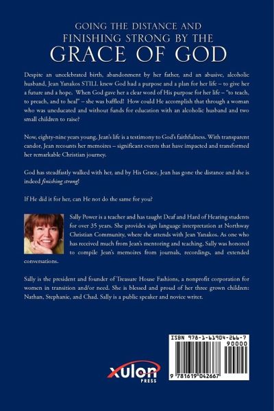 Despite an uncelebrated birth, abandonment by her father, and an abusive, alcoholic husband, Jean Yanakos STILL knew God had a purpose and a plan for her life - to give her a future and a hope. When God gave her a clear word of His purpose for her life - "to teach, to preach, and to heal" - she was baffled! How could He accomplish that through a woman who was uneducated and without funds for education with an alcoholic husband and two small children to raise? Now, eighty-nine years young, Jean's life is a testimony to God's faithfulness. With transparent candor, Jean recounts her memoires - significant events that have impacted and transformed her remarkable Christian journey. God has steadfastly walked with her, and by His Grace, Jean has gone the distance and she is indeed finishing strong! If He did it for her, can He not do the same for you? Sally Power is a teacher and has taught Deaf and Hard of Hearing students for over 35 years. She provides sign language interpretation at Northway Christian Community, where she attends with Jean Yanakos. As one who has received much from Jean's mentoring and teaching, Sally was honored to compile Jean's memoires from journals, recordings, and extended conversations. Sally is the president and founder of Treasure House Fashions, a nonprofit corporation for women in transition and/or need. She is blessed and proud of her three grown children: Nathan, Stephanie, and Chad. Sally is a public speaker and novice writer.