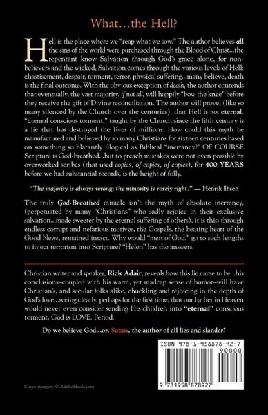 GOING TO...Helen A. Handbasket (If you are not chuckling...please look around and make sure you're alone. Okay...Step 1: Slowly read the pseudonym out loud. If you're still not at least smiling...take a deep breath, hold it...and exhale. Repeat Step 1. Now you got it. I thank you..."Helen" thanks you.) A revelation of Biblical proportions concerning the calculated and evil mistranslation of one Greek word in the fifth century promoting the myth (lie), of "eternal" conscious torment in Hell...woven through this intriguing tale is a memoir by a: follower of Christ, Vietnam Veteran-(fun-loving combat medic survivor), former alcoholic/drug addict, scribbling scribe, guitar player, often struggling, yet faithful servant of the Lord...and grateful recipient of His infinite Love and Grace. What the...Hell? Hell is the place where we "reap what we sow." The author believes all the sins of the world were purchased through the Blood of Christ...the repentant know Salvation through God's grace alone, for non-believers and the wicked, Salvation comes through the various levels of Hell: chastisement, despair, torment, terror, physical suffering...many believe, death is the final outcome. With the obvious exception of death, the author contends that eventually, the vast majority, if not all, will happily "bow the knee" before they receive the gift of Divine reconciliation. The author will prove, (like so many silenced by the Church over the centuries), that Hell is not eternal. "Eternal conscious torment," taught by the Church since the fifth century is a lie that has destroyed the lives of millions. How could this myth be manufactured and believed by so many Christians for sixteen centuries based on something so blatantly illogical as Biblical "inerrancy?" OF COURSE Scripture is God-breathed...but to preach mistakes were not even possible by overworked scribes (that used copies, of copies, of copies), for 400 YEARS before we had substantial records, is the height of folly. "The majority is always wrong; the minority is rarely right." -Henrik Ibsen The truly God-Breathed miracle isn't the myth of absolute inerrancy, (perpetuated by many "Christians" who sadly rejoice in their exclusive salvation...made sweeter by the eternal suffering of others), it is this: through endless corrupt and nefarious motives, the Gospels, the beating heart of the Good News, remained intact. Why would "men of God," go to such lengths to inject terrorism into Scripture? "Helen" has the answers. Do we believe God...or, Satan, the author of all lies and slander? Christian writer and speaker, Rick Adair, reveals how this lie came to be...his conclusions-coupled with his warm, yet madcap sense of humor-will have Christian's, and secular folks alike, chuckling and rejoicing in the depth of God's love...seeing clearly, perhaps for the first time, that our Father in Heaven would never even consider sending His children into "eternal" conscious torment. God is LOVE. Period.