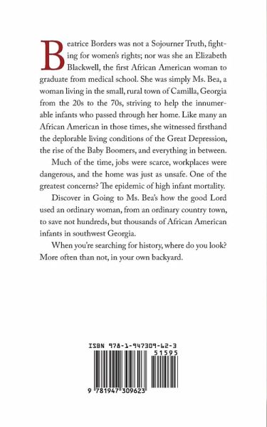Beatrice Borders was not a Sojourner Truth, fighting for women's rights; nor was she an Elizabeth Blackwell, the first African American woman to graduate from medical school. She was simply Ms. Bea, a woman living in the small, rural town of Camilla, Georgia from the 20s to the 70s, striving to help the innumerable infants who passed through her home. Like many an African American in those times, she witnessed firsthand the deplorable living conditions of the Great Depression, the rise of the Baby Boomers, and everything in between. Much of the time, jobs were scarce, workplaces were dangerous, and the home was just as unsafe. One of the greatest concerns? The epidemic of high infant mortality. Discover in Going to Ms. Bea's…the Baby Catcher how the good Lord used an ordinary woman, from an ordinary country town, to save not hundreds, but thousands of African American infants in southwest Georgia. When you're searching for history, where do you look? More often than not, in your own backyard.