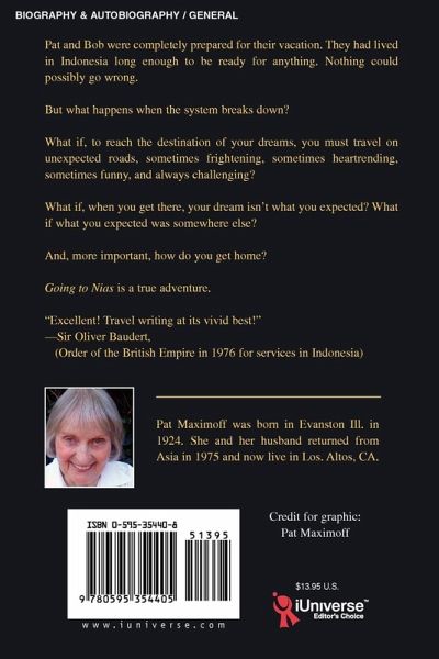 Pat and Bob were completely prepared for their vacation. They had lived in Indonesia long enough to be ready for anything. Nothing could possibly go wrong. But what happens when the system breaks down? What if, to reach the destination of your dreams, you must travel on unexpected roads, sometimes frightening, sometimes heartrending, sometimes funny, and always challenging? What if, when you get there, your dream isn't what you expected? What if what you expected was somewhere else? And, more important, how do you get home? Going to Nias is a true adventure. 'Excellent! Travel writing at its vivid best!" -Sir Oliver Baudert, (Order of the British Empire in 1976 for services in Indonesia)