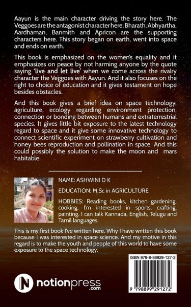 Aayun is the main character driving the story here. The Veggoes are the antagonist character here. Bharath, Abhyartha, Aardhaman, Banmith and Apricon are the supporting characters here. This story began on earth, went into space and ends on earth. This book is emphasized on the women's equality and it emphasizes on peace by not harming anyone by the quote saying 'live and let live' when we come across the rivalry character the Veggoes with Aayun. And it also focuses on the right to choice of education and it gives testament on hope besides obstacles. And this book gives a brief idea on space technology, agriculture, ecology regarding environment protection, connection or bonding between humans and extraterrestrial species. It gives little bit exposure to the latest technology regard to space and it give some innovative technology to connect scientific experiment on strawberry cultivation and honey bees reproduction and pollination in space. And this could possibly the solution to make the moon and mars habitable.