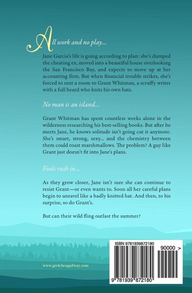 When accountant Jane finds herself attracted to handsome, free-spirited Grant, will she pursue her long-term goals... or her heart? All work and no play... Jane Garcia's life is going according to plan: she's dumped the cheating ex, moved into a beautiful house overlooking the San Francisco Bay, and expects to move up at her accounting firm. But when financial trouble strikes, she's forced to rent a room to Grant Whitman, a scruffy writer with a full beard who knits his own hats. No man is an island... Grant Whitman has spent countless weeks alone in the wilderness researching his best-selling books. But after he meets Jane, he knows solitude isn't going cut it anymore. She's smart, strong, sexy... and the chemistry between them could roast marshmallows. The problem? A guy like Grant just doesn't fit into Jane's plans. Fools rush in... As they grow closer, Jane isn't sure she can continue to resist Grant-or even wants to. Soon all her careful plans begin to unravel like a badly knitted hat. And then, to his surprise, so do Grant's. But can their wild fling outlast the summer?