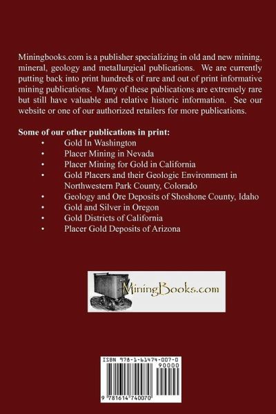 Gold Deposits of Georgia was originally published in 1909 as the "Second Report on the Gold Deposits of Georgia" by S.P. Jones of the Geological Survey of Georgia, Bulletin 19. The Georgia Gold Belt was one of the first major Gold discoveries in the United States. While there are thousands of publications on the goldfields of say Alaska or California, there are very few on the Deposits in Georgia. Bulletin 19 now back in print by Miningbooks.com covers this region extensively giving historical information as well as the Geology, Ore Deposits, Locations of the Placers and Lodes, and mines where gold was found. If you're looking for Gold in Georgia then this is a must have publication. 310 Pages.