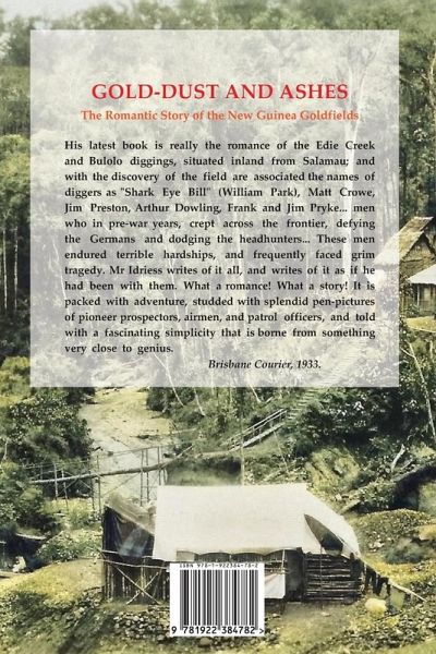 The Romantic Story of the New Guinea Goldfields. His latest book is really the romance of the Edie Creek and Bulolo diggings, situated inland from Salamau; and with the discovery of the field are associated the names of diggers as "Shark Eye Bill" (William Park), Matt Crowe, Jim Preston, Arthur Dowling, Frank and Jim Pryke ... men who in pre-war years, crept across the frontier, defying the Germans and dodging the headhunters ... These men endured terrible hardships, and frequently faced grim tragedy. Mr Idriess writes of it all, and writes of it as if he had been with them. What a romance! What a story! It is packed with adventure, studded with splendid pen-pictures of pioneer prospectors, airmen, and patrol officers, and told with a fascinating simplicity that is borne from something very close to genius. - Brisbane Courier, 1933.