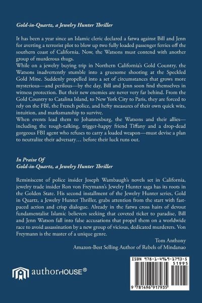Gold-in-Quartz, a Jewelry Hunter Thriller It has been a year since an Islamic cleric declared a fatwa against Bill and Jenn for averting a terrorist plot to blow up two fully loaded passenger ferries off the southern coast of California. Now, the Watsons must contend with another group of murderous thugs. While on a jewelry buying trip in Northern California's Gold Country, the Watsons inadvertently stumble into a gruesome shooting at the Speckled Gold Mine. Suddenly propelled into a set of circumstances that grows more mysterious-and perilous-by the day, Bill and Jenn soon find themselves in witness protection. But their new enemies are never very far behind. From the Gold Country to Catalina Island, to New York City to Paris, they are forced to rely on the FBI, the French police, and hefty measures of their own quick wits, intuition, and marksmanship to survive. When events lead them to Johannesburg, the Watsons and their allies-including the tough-talking, trigger-happy friend Tiffany and a drop-dead gorgeous FBI agent who refuses to carry a loaded weapon-must devise a plan to neutralize their adversary... before their luck runs out. In Praise Of Gold-in-Quartz, a Jewelry Hunter Thriller Reminiscent of police insider Joseph Wambaugh's novels set in California, jewelry trade insider Ron von Freymann's Jewelry Hunter saga has its roots in the Golden State. His second installment of the Jewelry Hunter series, Gold in Quartz, a Jewelry Hunter Thriller, grabs attention from the start with fast-paced action and crisp dialogue. Already in the fatwa cross hairs of devout fundamentalist Islamic believers seeking that coveted ticket to paradise, Bill and Jenn Watson fall into false accusations that propel them on a worldwide race to avoid assassination by a new group of vicious, dedicated murderers. Von Freymann is the master of a unique genre. Tom Anthony Amazon-Best Selling Author of Rebels of Mindanao