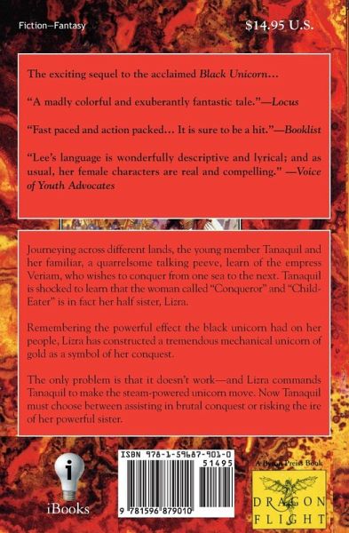 The exciting sequel to the acclaimed Black Unicorn... "A madly colorful and exuberantly fantastic tale."-Locus "Fast paced and action packed... It is sure to be a hit."-Booklist "Lee's language is wonderfully descriptive and lyrical; and as usual, her female characters are real and compelling." -Voice of Youth Advocates Journeying across different lands, the young member Tanaquil and her familiar, a quarrelsome talking peeve, learn of the empress Veriam, who wishes to conquer from one sea to the next. Tanaquil is shocked to learn that the woman called "Conqueror" and "Child-Eater" is in fact her half sister, Lizra. Remembering the powerful effect the black unicorn had on her people, Lizra has constructed a tremendous mechanical unicorn of gold as a symbol of her conquest. The only problem is that it doesn't work-and Lizra commands Tanaquil to make the steam-powered unicorn move. Now Tanaquil must choose between assisting in brutal conquest or risking the ire of her powerful sister.
