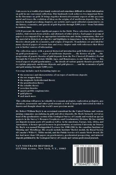 GOLD: History and Genesis of Deposits is the product of an effort by the Society of Economic Geologists to publish materials that will expand knowl edge concerning timely, specific topics important to the study of economic geology and to economic geologists. A volume on gold was selected for a general review-type publication because of the importance of the gold mining industry in the 1980s. The officers and council of the Society of Economic Geologists authorized the preparation of this book on gold in 1981, and Dr. Robert W. Boyle was selected as its author. Dr. Boyle has extensive experience in the study of gold deposits. He has an international reputation and a broad interest and understanding of the gold mining industry, the origin of gold deposits, and the history of gold as a metal and ore from prehistoric times to recent. Dr. Boyle uses important publications on gold deposits as source materials to document the various pathways of geological thought over time to introducethe reader to modern concepts. The book contains a wealth of information concerning gold.