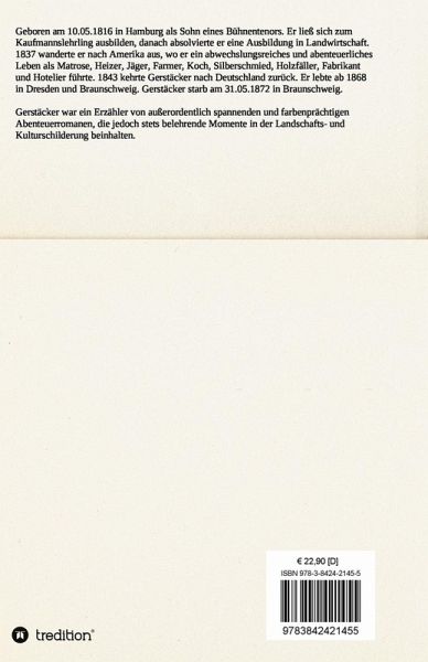 Geboren am 10.05.1816 in Hamburg als Sohn eines Bühnentenors. Er ließ sich zum Kaufmannslehrling ausbilden, danach absolvierte er eine Ausbildung in Landwirtschaft. 1837 wanderte er nach Amerika aus, wo er ein abwechslungsreiches und abenteuerliches Leben als Matrose, Heizer, Jäger, Farmer, Koch, Silberschmied, Holzfäller, Fabrikant und Hotelier führte. 1843 kehrte Gerstäcker nach Deutschland zurück. Er lebte ab 1868 in Dresden und Braunschweig. Gerstäcker starb am 31.05.1872 in Braunschweig.Gerstäcker war ein Erzähler von außerordentlich spannenden und farbenprächtigen Abenteuerromanen, die jedoch stets belehrende Momente in der Landschafts- und Kulturschilderung beinhalten.