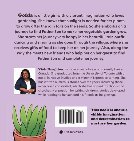Golda is a little girl with a vibrant imagination who loves gardening. She knows that sunlight is needed for her plants to grow after the rain falls on the seeds. So she embarks on a journey to find Father Sun to make her vegetable garden grow. She starts her journey very happy in her beautiful rain outfit dancing and singing as she goes through the village, where she receives gifts of food to keep her on her journey. Also, along the way she meets new friends who help her on her quest to find Father Sun and complete her journey.