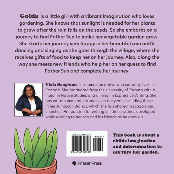 Golda is a little girl with a vibrant imagination who loves gardening. She knows that sunlight is needed for her plants to grow after the rain falls on the seeds. So she embarks on a journey to find Father Sun to make her vegetable garden grow. She starts her journey very happy in her beautiful rain outfit dancing and singing as she goes through the village, where she receives gifts of food to keep her on her journey. Also, along the way she meets new friends who help her on her quest to find Father Sun and complete her journey.