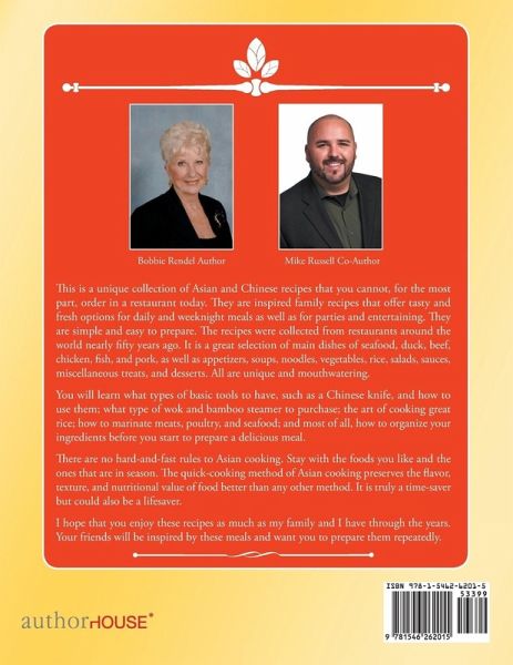 This is a unique collection of Asian and Chinese recipes that you cannot, for the most part, order in a restaurant today. They are inspired family recipes that offer tasty and fresh options for daily and weeknight meals as well as for parties and entertaining. They are simple and easy to prepare. The recipes were collected from restaurants around the world nearly fifty years ago. It is a great selection of main dishes of seafood, duck, beef, chicken, fish, and pork, as well as appetizers, soups, noodles, vegetables, rice, salads, sauces, miscellaneous treats, and desserts. All are unique and mouthwatering. You will learn what types of basic tools to have, such as a Chinese knife, and how to use them; what type of wok and bamboo steamer to purchase; the art of cooking great rice; how to marinate meats, poultry, and seafood; and most of all, how to organize your ingredients before you start to prepare a delicious meal. There are no hard-and-fast rules to Asian cooking. Stay with the foods you like and the ones that are in season. The quick-cooking method of Asian cooking preserves the flavor, texture, and nutritional value of food better than any other method. It is truly a time-saver but could also be a lifesaver. I hope that you enjoy these recipes as much as my family and I have through the years. Your friends will be inspired by these meals and want you to prepare them repeatedly.
