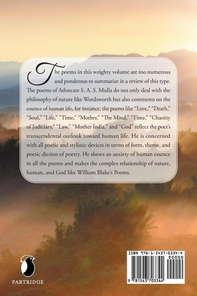 The poems in this weighty volume are too numerous and ponderous to summarize in a review of this type. The poems of Advocate S. A. S. Mulla do not only deal with the philosophy of nature like Wordsworth but also comments on the essence of human life, for instance, the poems like "Love," "Death," "Soul," "Life," "Time," "Mother," "The Mind," "Time," "Chastity of Judiciary," "Law," "Mother India," and "God" reflect the poet's transcendental outlook toward human life. He is concerned with all poetic and stylistic devices in terms of form, theme, and poetic diction of poetry. He shows an anxiety of human essence in all the poems and makes the complex relationship of nature, human, and God like William Blake's Poems.