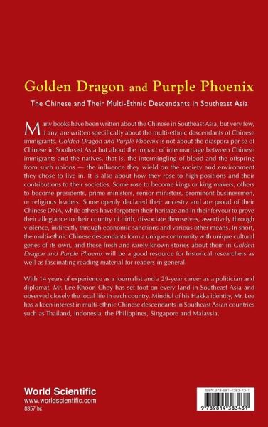 Many books have been written about the Chinese in Southeast Asia, but very few, if any, are written specifically about the multi-ethnic descendants of Chinese immigrants. Golden Dragon and Purple Phoenix is not about the diaspora per se of Chinese in Southeast Asia but about the impact of intermarriage between Chinese immigrants and the natives, that is, the intermingling of blood and the offspring from such unions -- the influence they wielded on the society and environment they chose to live in. It is also about how they rose to high positions and their contributions to their societies. Some rose to become kings or king makers, others to become presidents, prime ministers, senior ministers, prominent businessmen, or religious leaders. Some openly declared their ancestry and are proud of their Chinese DNA, while others have forgotten their heritage and in their fervour to prove their allegiance to their country of birth, dissociate themselves, assertively through violence, indirectly through economic sanctions and various other means. In short, the multi-ethnic Chinese descendants form a unique community with unique cultural genes of its own, and these fresh and rarely-known stories about them in this book will be a good resource for historical researchers as well as fascinating reading materials for readers in general.With 14 years' experience as a journalist and a 29-year career as a politician and diplomat, Mr. Lee Khoon Choy has set foot on every land in Southeast Asia and observed closely the local life in each country. Mindful of his Hakka identity, Mr. Lee has a keen interest in multi-ethnic Chinese descendants in Southeast Asian countries such as Thailand, Indonesia, the Philippines, Singapore and Malaysia, etc.