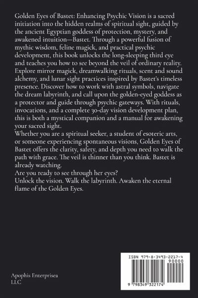 Golden Eyes of Bastet: Enhancing Psychic Vision is a sacred initiation into the hidden realms of spiritual sight, guided by the ancient Egyptian goddess of protection, mystery, and awakened intuition-Bastet. Through a powerful fusion of mythic wisdom, feline magick, and practical psychic development, this book unlocks the long-sleeping third eye and teaches you how to see beyond the veil of ordinary reality. Explore mirror magick, dreamwalking rituals, scent and sound alchemy, and lunar sight practices inspired by Bastet's timeless presence. Discover how to work with astral symbols, navigate the dream labyrinth, and call upon the golden-eyed goddess as a protector and guide through psychic gateways. With rituals, invocations, and a complete 30-day vision development plan, this is both a mystical companion and a manual for awakening your sacred sight. Whether you are a spiritual seeker, a student of esoteric arts, or someone experiencing spontaneous visions, Golden Eyes of Bastet offers the clarity, safety, and depth you need to walk the path with grace. The veil is thinner than you think. Bastet is already watching. Are you ready to see through her eyes? Unlock the vision. Walk the labyrinth. Awaken the eternal flame of the Golden Eyes.
